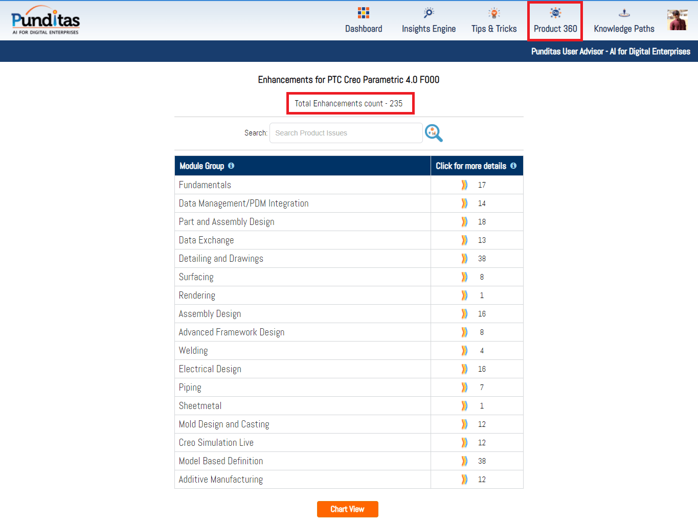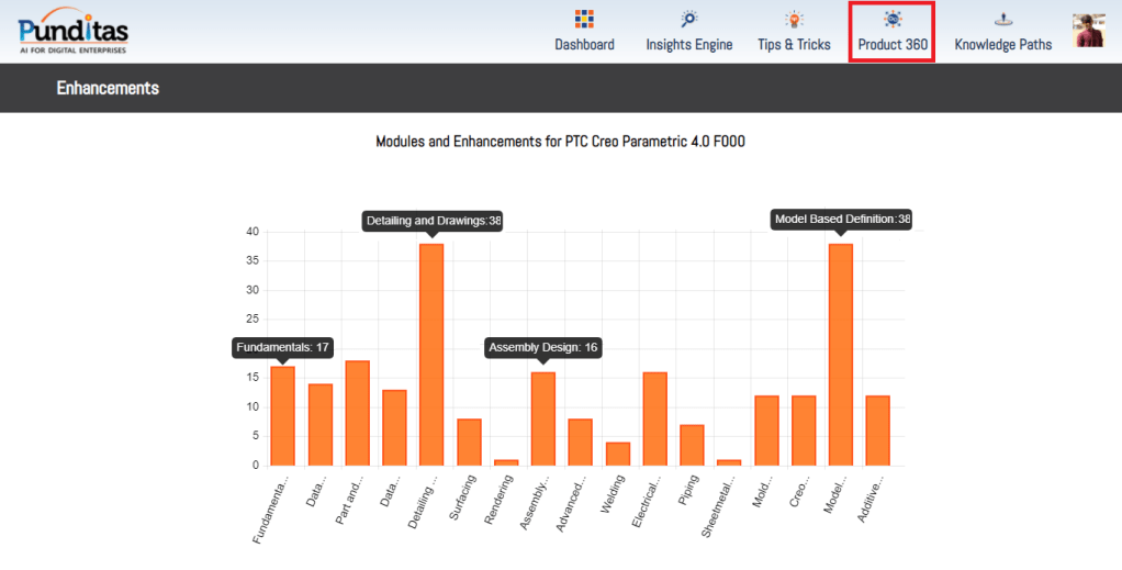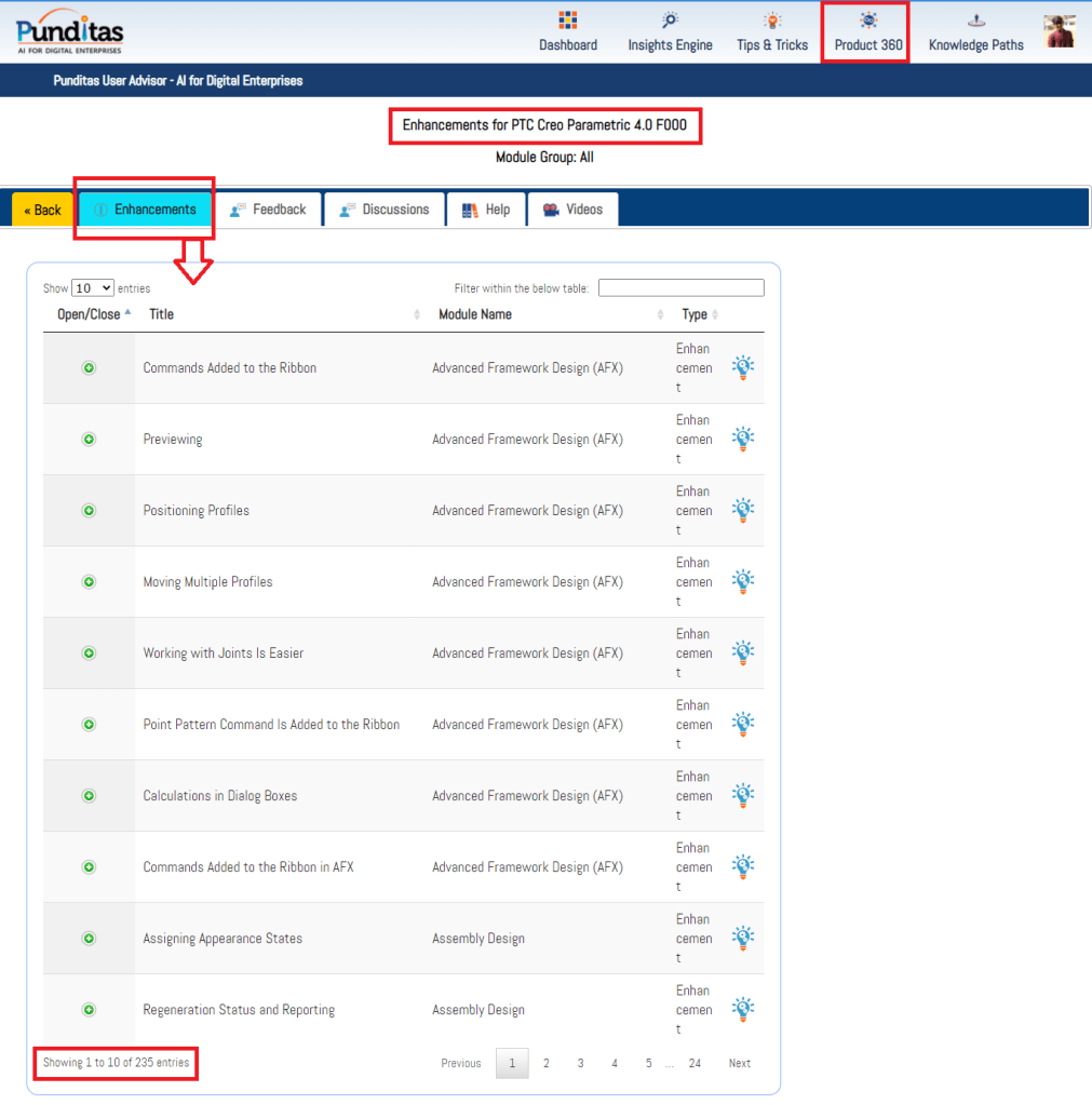 Punditas AI Advisor supports Creo 4.0 F000. Punditas AI allows users to learn more about “How”, What” and “Why” of these enhancements through Product 360 module. The picture below shows the Module groups and the corresponding enhancements added within each group. To try this out, please signup for a FREE trial at Punditas AI