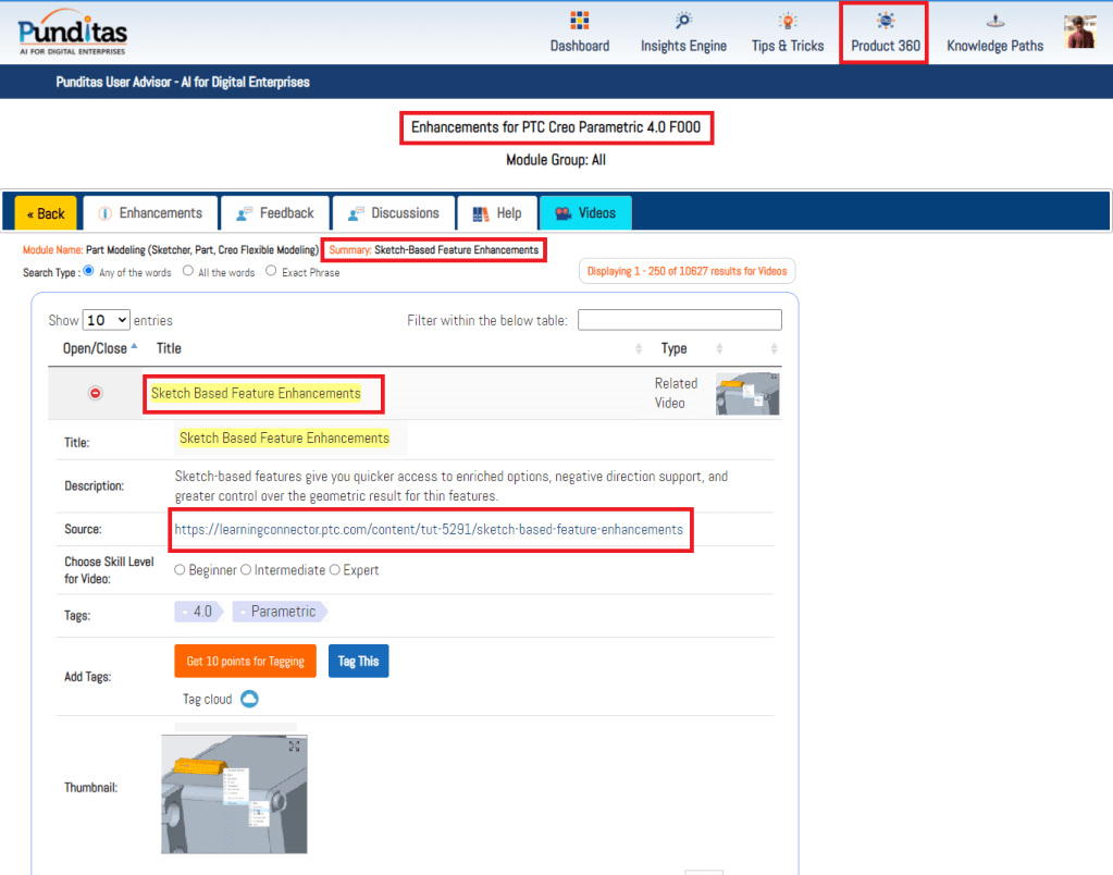 Punditas AI Advisor also offers Video Tutorials for every enhancement to help Users learn how to use the feature in Creo Parametric software. The image below shows the related videos for “Part Modeling” that has been updated in Creo 4.0 F000 These Videos are extracted and curated by Punditas AI engine from 10’s of repositories including PTC’s Learning Connector, YouTube, Vimeo, etc.