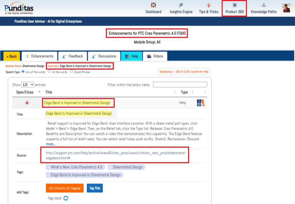 The Detailed View option in Punditas AI allows Creo Users to explore each enhancement in greater detail. The picture below shows the details of every enhancement in Creo 4.0 F000. Not only is the list of enhancements displayed but also the associated Video tutorials, Online Help documentation (provided by PTC) as well as community discussions around this topic
