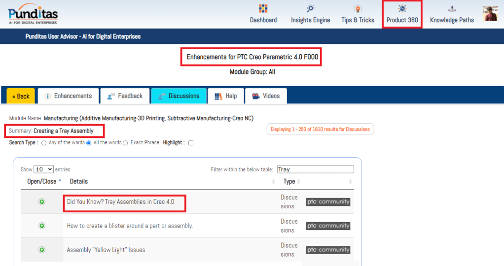 Punditas AI Advisor is a powerful platform as Users can access a single source of community chatter (discussions, opinions, suggestions) from both PTC and non-PTC sources. The image below shows discussions from PTC community related to “Manufacturing” enhancement in Creo 4.0 F000