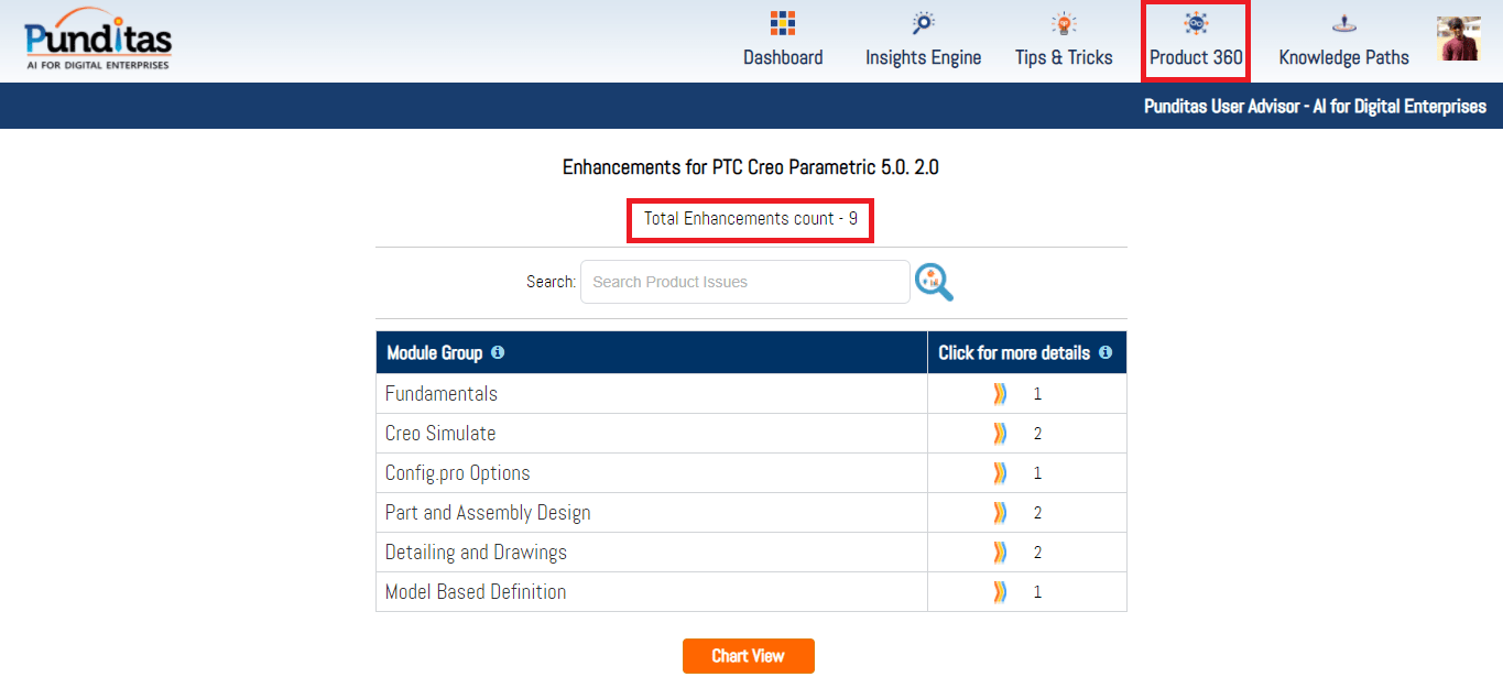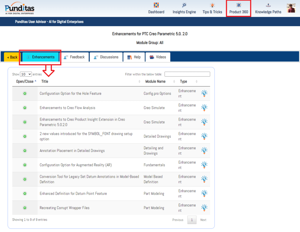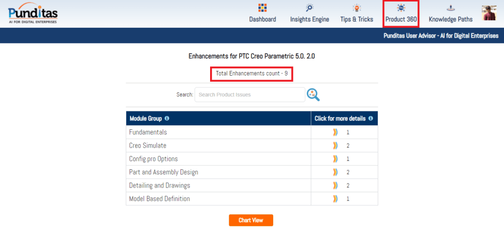 PTC released Creo 5.0.2.0 recently. Punditas AI Advisor now supports this latest version of Creo 5.0.2.0. Punditas AI allows users to learn more about “How”, What” and “Why” of these enhancements through Product 360 module. The picture below shows the Module groups and the corresponding enhancements added within each group. To try this out, please signup for a FREE trial at Punditas AI