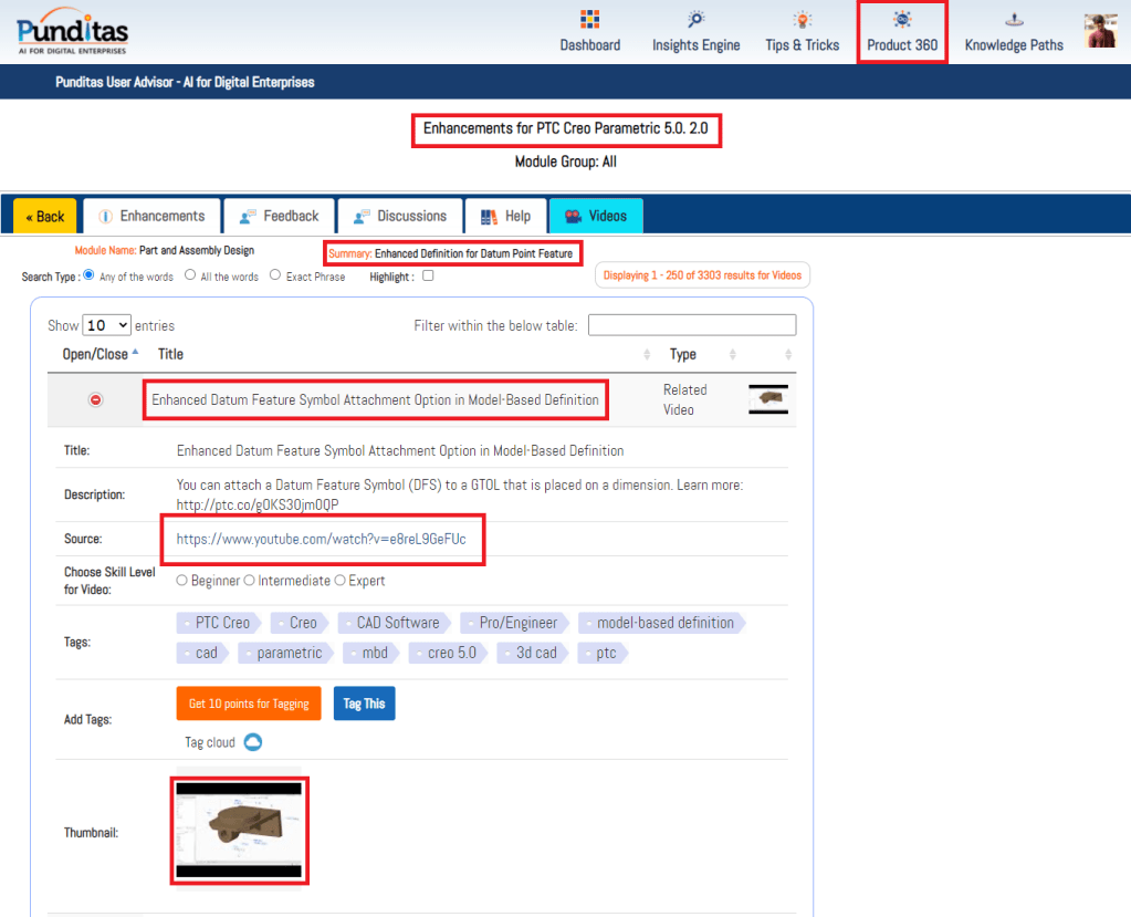 Punditas AI Advisor also offers Video Tutorials for every enhancement to help Users learn how to use the feature in Creo Parametric software. The image below shows the related videos for “Part and Assembly Design” that has been updated in Creo 5.0.2.0 These Videos are extracted and curated by Punditas AI engine from 10’s of repositories including PTC’s Learning Connector, YouTube, Vimeo, etc.