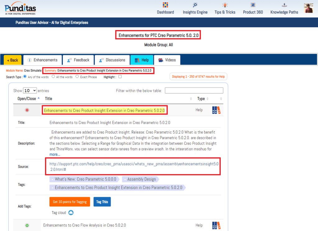 The Detailed View option in Punditas AI allows Creo Users to explore each enhancement in greater detail. The picture below shows the details of every enhancement in Creo 5.0.2.0. Not only is the list of enhancements displayed but also the associated Video tutorials, Online Help documentation (provided by PTC) as well as community discussions around this topic