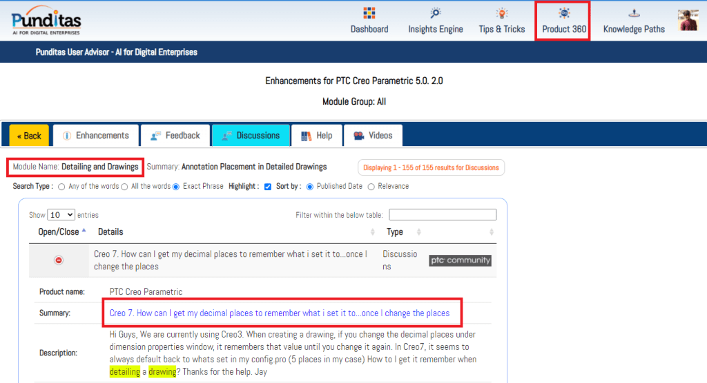Punditas AI Advisor is a powerful platform as Users can access a single source of community chatter (discussions, opinions, suggestions) from both PTC and non-PTC sources. The image below shows discussions from PTC community related to “Detailing and Drawings” enhancement in Creo 5.0.2.0