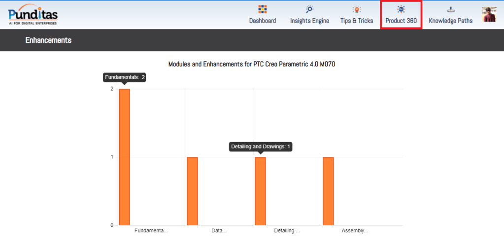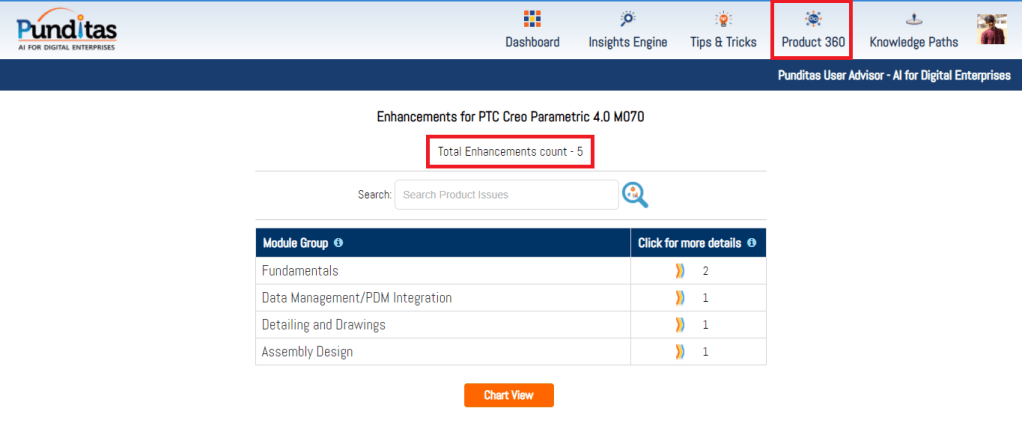 Punditas AI Advisor supports Creo 4.0 M070. Punditas AI allows users to learn more about “How”, What” and “Why” of these enhancements through Product 360 module. The picture below shows the Module groups and the corresponding enhancements added within each group. To try this out, please signup for a FREE trial at Punditas AI