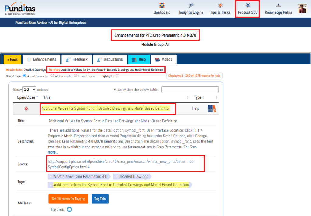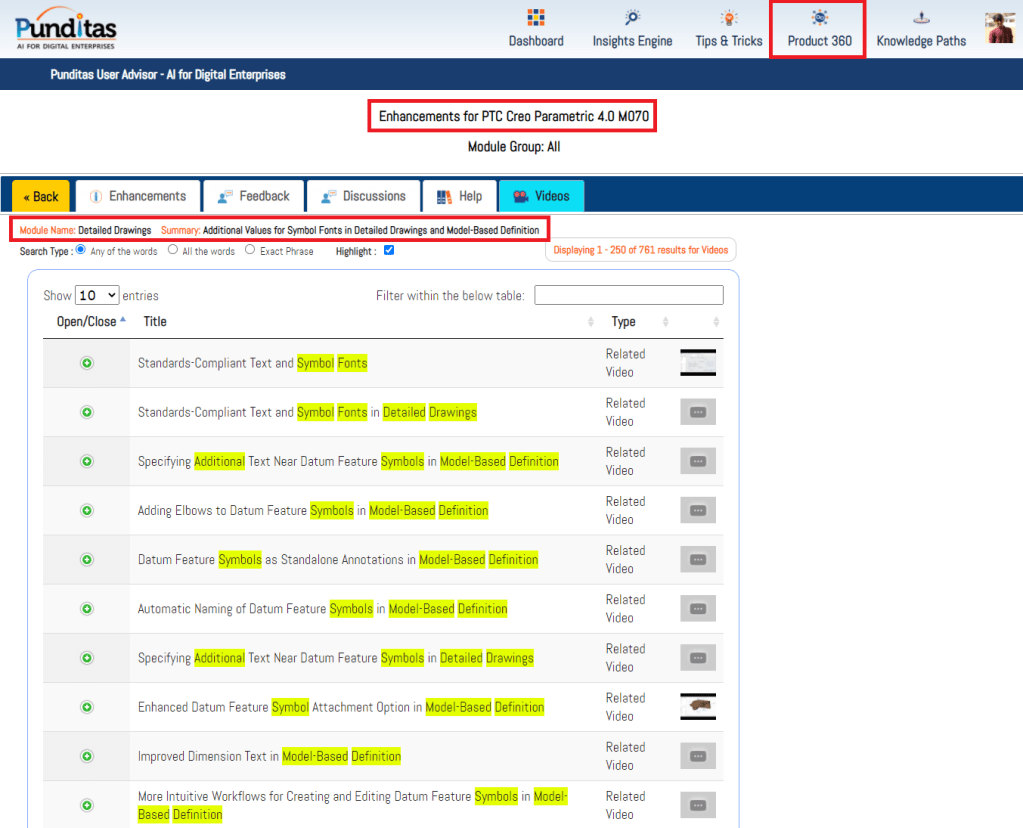 The Detailed View option in Punditas AI allows Creo Users to explore each enhancement in greater detail. The picture below shows the details of every enhancement in Creo 4.0 M070. Not only is the list of enhancements displayed but also the associated Video tutorials, Online Help documentation (provided by PTC) as well as community discussions around this topic