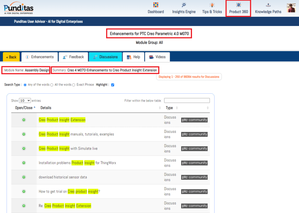 Punditas AI Advisor is a powerful platform as Users can access a single source of community chatter (discussions, opinions, suggestions) from both PTC and non-PTC sources. The image below shows discussions from PTC community related to “Assembly Design” enhancement in Creo 4.0 M070