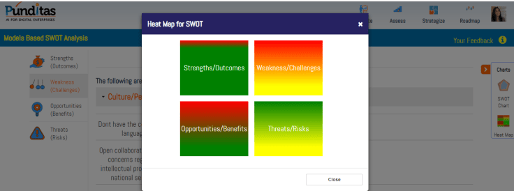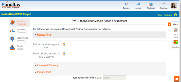 Dashboard Analytics: Simple & Easy to use platform for your design partners and suppliers Bar charts summarize your projected versus realized SWOT values- Collaborative platform: SWOT analysis is valuable when you have the input from the participating groups/teams across your extended enterprise