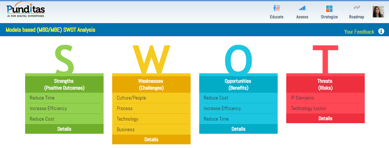 This adapted version of SWOT Analysis in Punditas MBE Advisor is a strategic planning tool that’s used to evaluate the Strengths, Weaknesses, Opportunities, and Threats of your Model Based Enterprise initiative.
