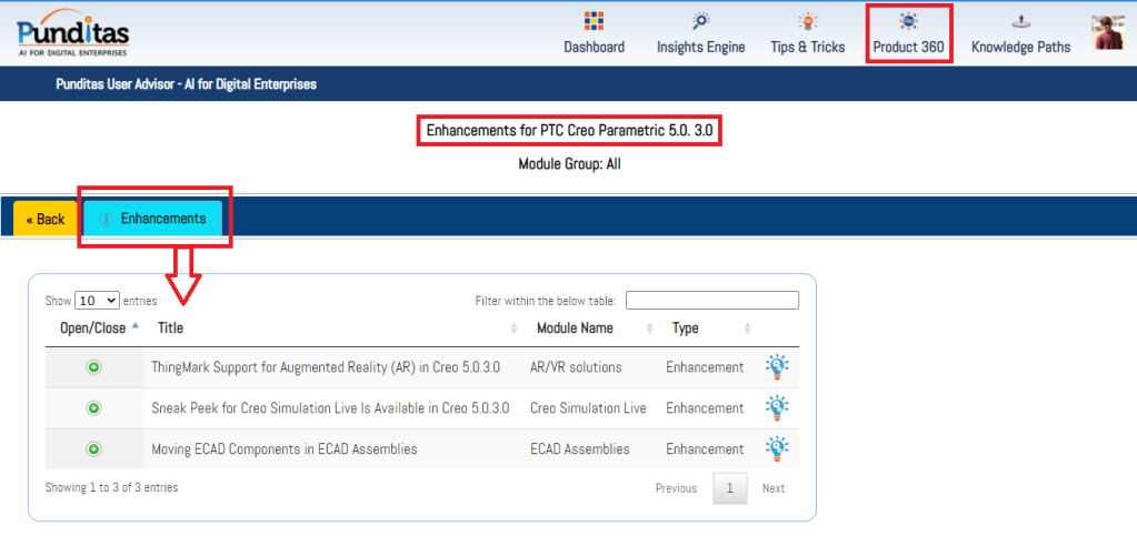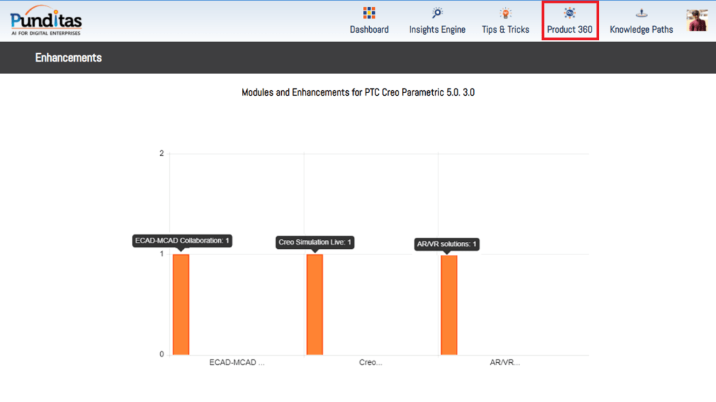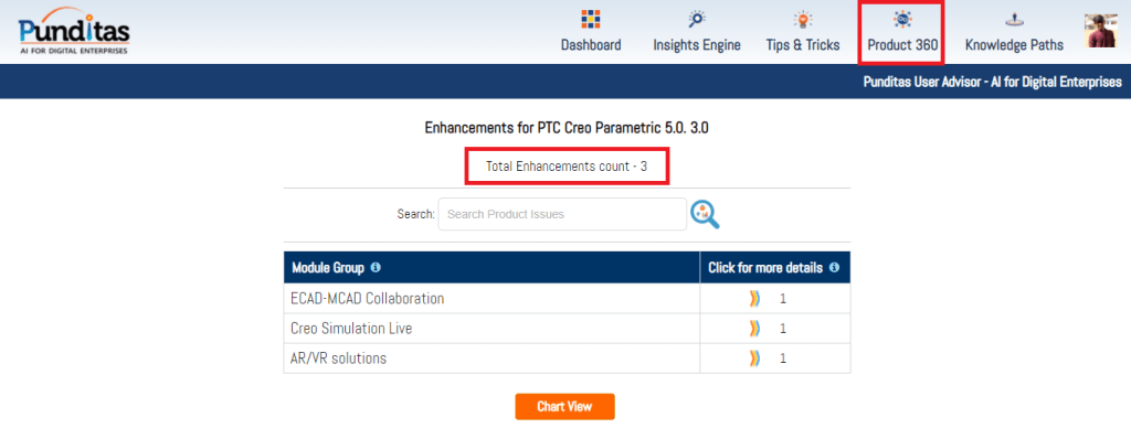 PTC released Creo 5.0.3.0 recently. Punditas AI Advisor now supports this latest version of Creo 5.0.3.0. Punditas AI allows users to learn more about “How”, What” and “Why” of these enhancements through Product 360 module. The picture below shows the Module groups and the corresponding enhancements added within each group. To try this out, please signup for a FREE trial at Punditas AI
