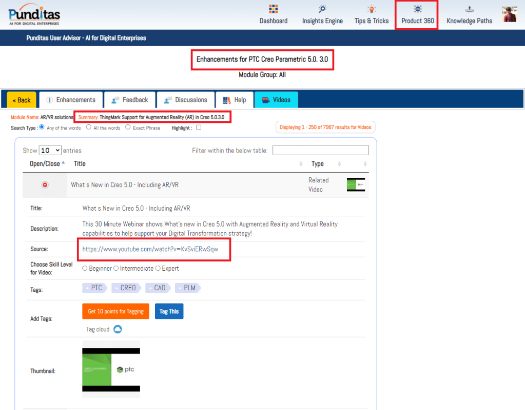 Punditas AI Advisor also offers Video Tutorials for every enhancement to help Users learn how to use the feature in Creo Parametric software. The image below shows the related videos for “AR/VR Solutions” that has been updated in Creo 5.0.3.0 These Videos are extracted and curated by Punditas AI engine from 10’s of repositories including PTC’s Learning Connector, YouTube, Vimeo, etc.