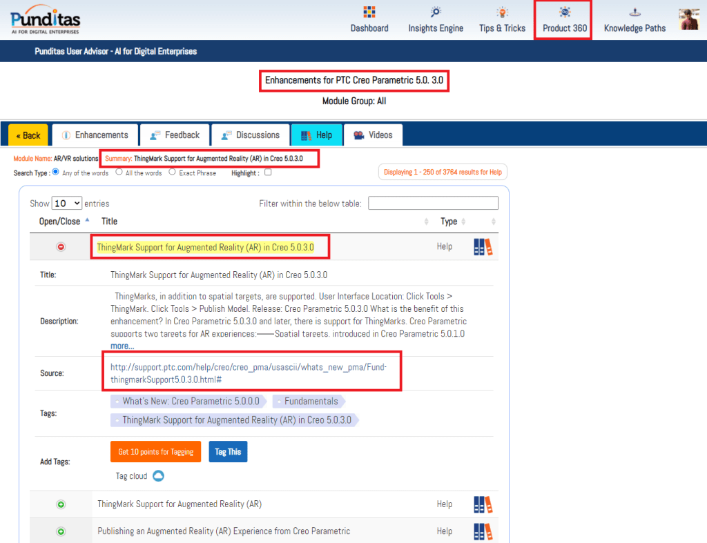 The Detailed View option in Punditas AI allows Creo Users to explore each enhancement in greater detail. The picture below shows the details of every enhancement in Creo 5.0.3.0. Not only is the list of enhancements displayed but also the associated Video tutorials, Online Help documentation (provided by PTC) as well as community discussions around this topic
