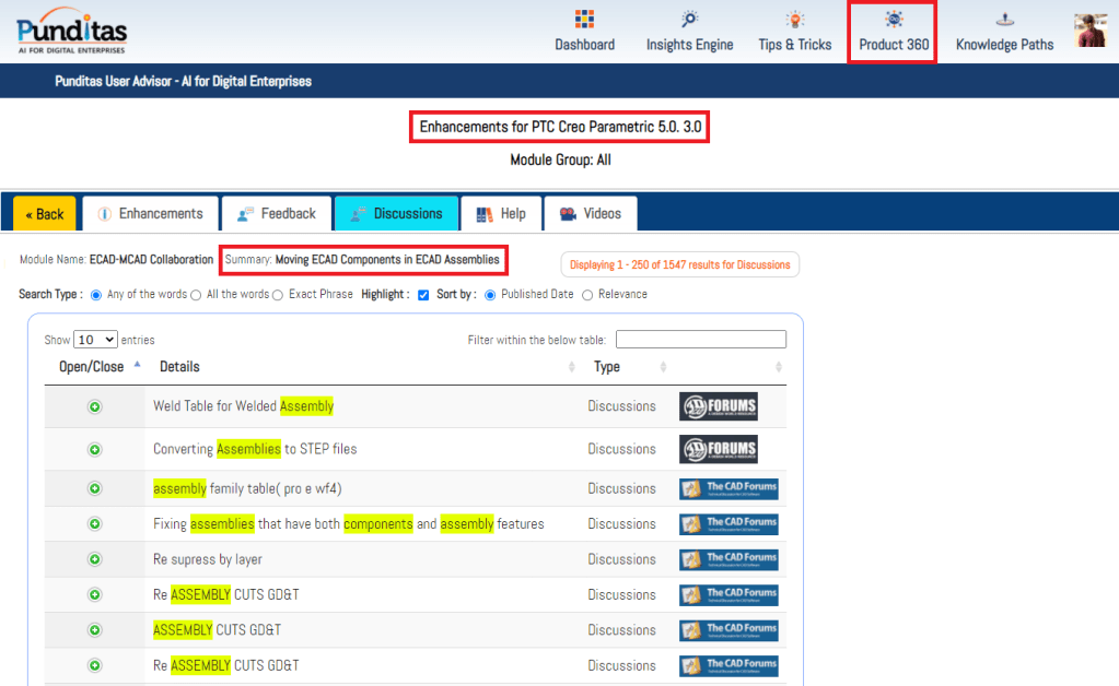 Punditas AI Advisor is a powerful platform as Users can access a single source of community chatter (discussions, opinions, suggestions) from both PTC and non-PTC sources. The image below shows discussions from PTC community related to “ECAD Assemblies” enhancement in Creo 5.0.3.0