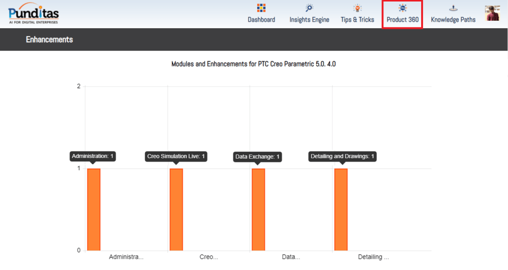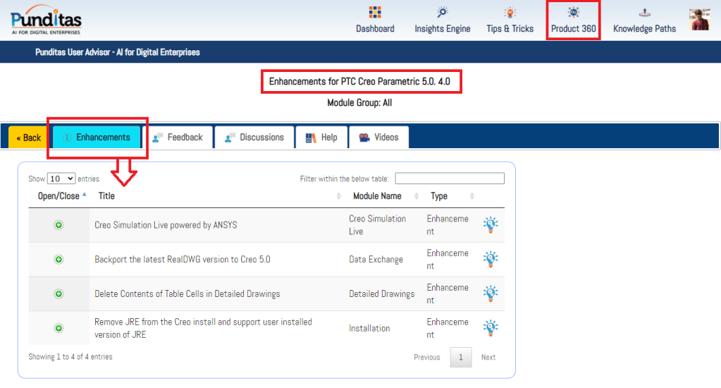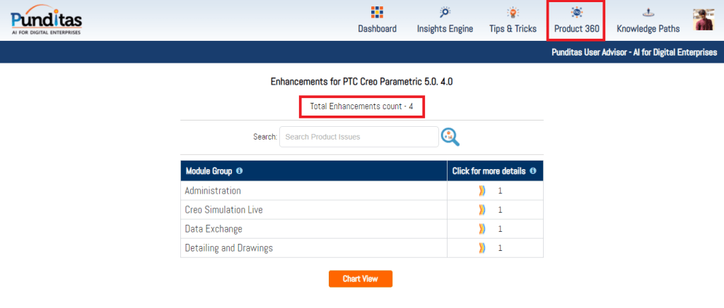 PTC released Creo 5.0.4.0 recently. Punditas AI Advisor now supports this latest version of Creo 5.0.4.0. Punditas AI allows users to learn more about “How”, What” and “Why” of these enhancements through Product 360 module. The picture below shows the Module groups and the corresponding enhancements added within each group. To try this out, please signup for a FREE trial at Punditas AI