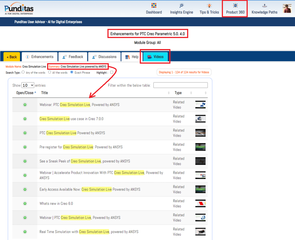 Punditas AI Advisor also offers Video Tutorials for every enhancement to help Users learn how to use the feature in Creo Parametric software. The image below shows the related videos for “Creo Simulation Live” that has been updated in Creo 5.0.4.0 These Videos are extracted and curated by Punditas AI engine from 10’s of repositories including PTC’s Learning Connector, YouTube, Vimeo, etc.
