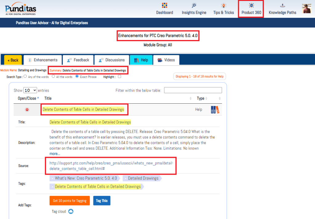 The Detailed View option in Punditas AI allows Creo Users to explore each enhancement in greater detail. The picture below shows the details of every enhancement in Creo 5.0.4.0. Not only is the list of enhancements displayed but also the associated Video tutorials, Online Help documentation (provided by PTC) as well as community discussions around this topic