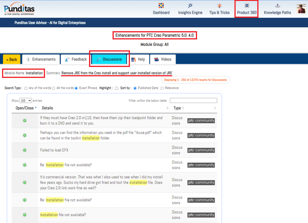 Punditas AI Advisor is a powerful platform as Users can access a single source of community chatter (discussions, opinions, suggestions) from both PTC and non-PTC sources. The image below shows discussions from PTC community related to “Installation” enhancement in Creo 5.0.4.0