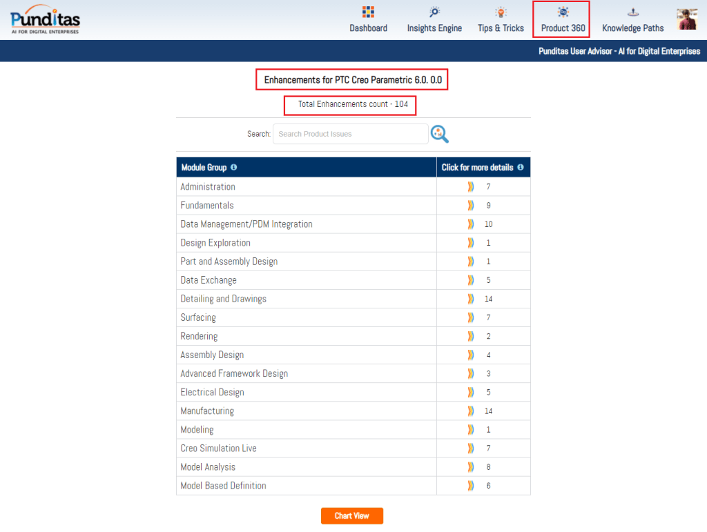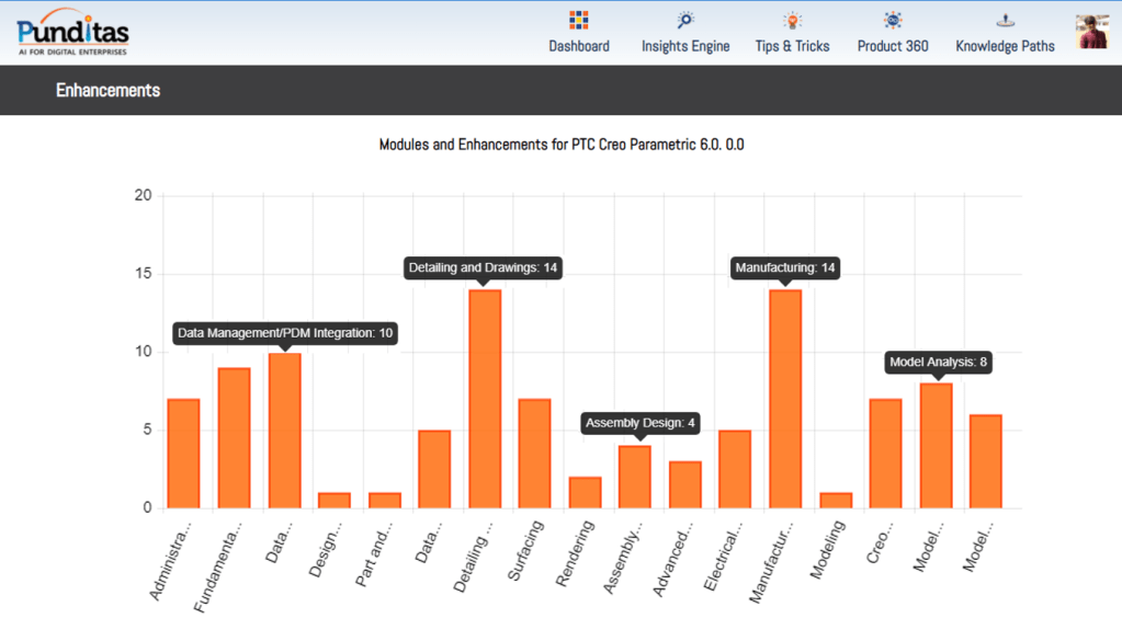 PTC released Creo 6.0.0.0 recently. Punditas AI Advisor now supports this latest version of Creo 6.0.0.0. Punditas AI allows users to learn more about “How”, What” and “Why” of these enhancements through Product 360 module. The picture below shows the Module groups and the corresponding enhancements added within each group. To try this out, please signup for a FREE trial at Punditas AI