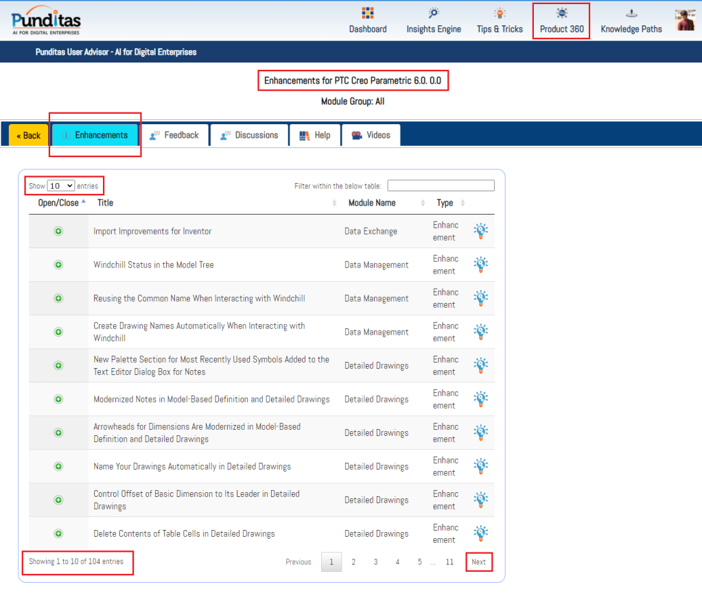 The Detailed View option in Punditas AI allows Creo Users to explore each enhancement in greater detail. The picture below shows the details of every enhancement in Creo 6.0.0.0. Not only is the list of enhancements displayed but also the associated Video tutorials, Online Help documentation (provided by PTC) as well as community discussions around this topic
