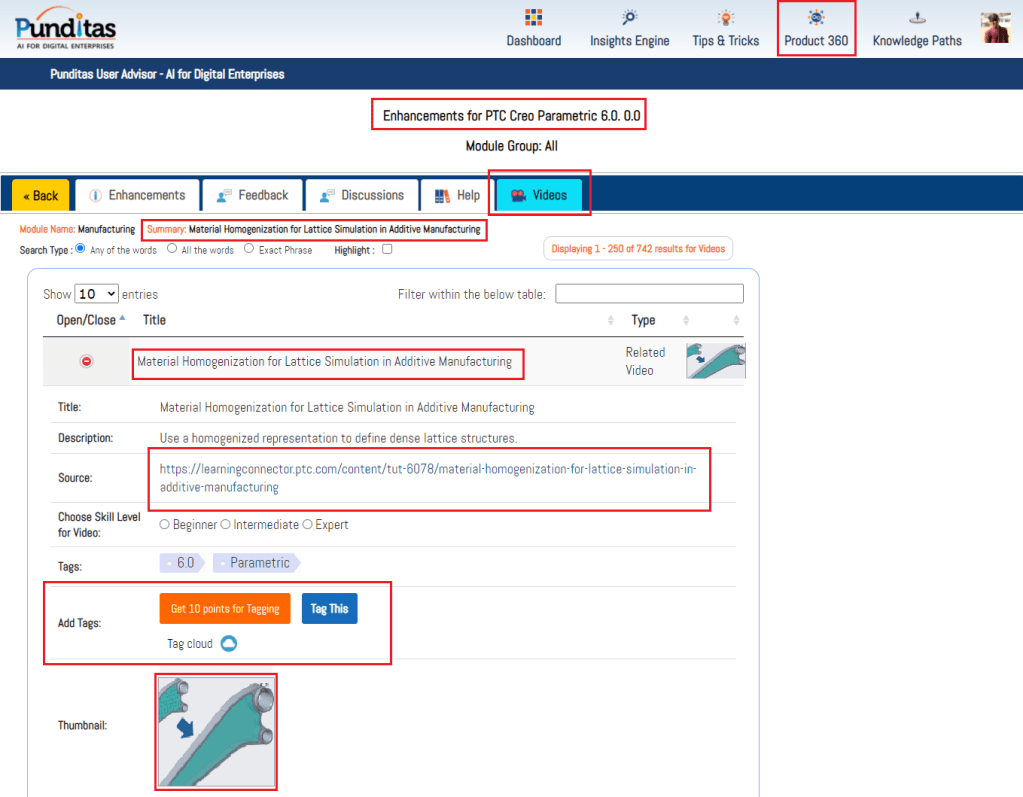 Punditas AI Advisor also offers Video Tutorials for every enhancement to help Users learn how to use the feature in Creo Parametric software. The image below shows the related videos for “Manufacturing” that has been updated in Creo 6.0.0.0 These Videos are extracted and curated by Punditas AI engine from 10’s of repositories including PTC’s Learning Connector, YouTube, Vimeo, etc.
