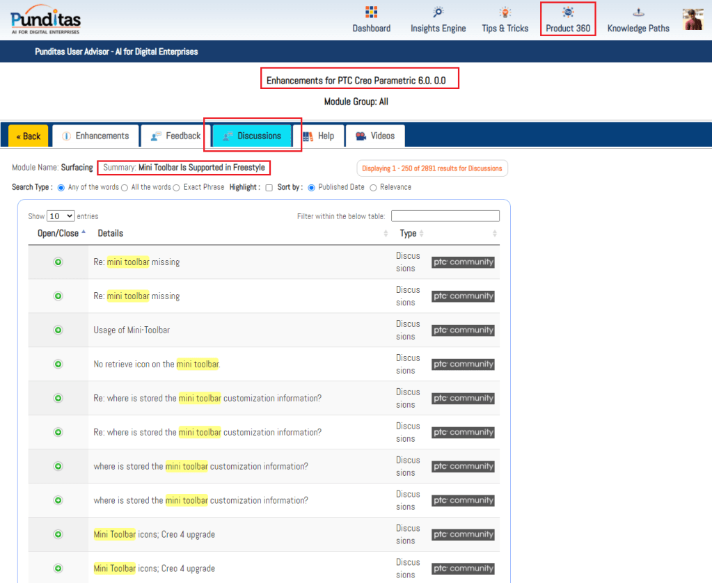 Punditas AI Advisor is a powerful platform as Users can access a single source of community chatter (discussions, opinions, suggestions) from both PTC and non-PTC sources. The image below shows discussions from PTC community related to “Surfacing” enhancement in Creo 6.0.0.0
