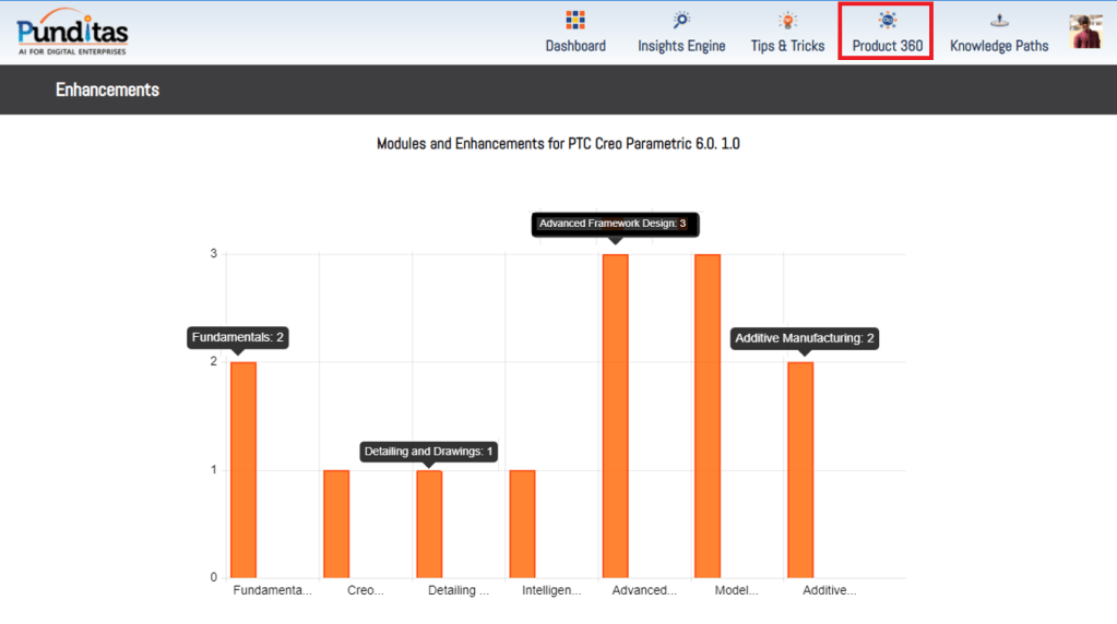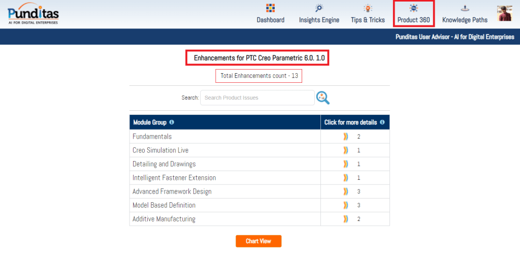PTC released Creo 6.0.1.0 recently. Punditas AI Advisor now supports this latest version of Creo 6.0.1.0. Punditas AI allows users to learn more about “How”, What” and “Why” of these enhancements through Product 360 module. The picture below shows the Module groups and the corresponding enhancements added within each group. To try this out, please signup for a FREE trial at Punditas AI