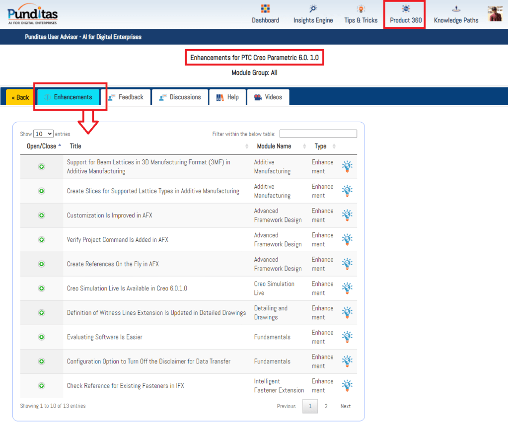 The Detailed View option in Punditas AI allows Creo Users to explore each enhancement in greater detail. The picture below shows the details of every enhancement in Creo 6.0.1.0. Not only is the list of enhancements displayed but also the associated Video tutorials, Online Help documentation (provided by PTC) as well as community discussions around this topic