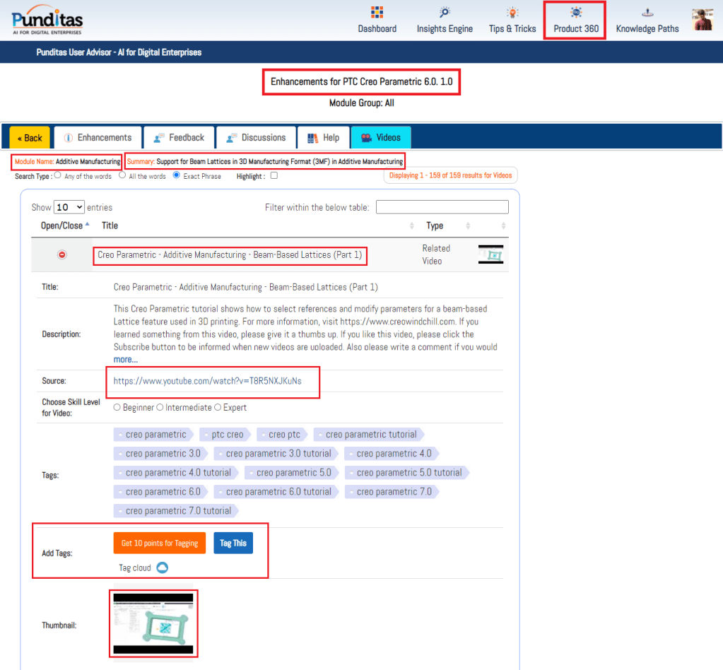Punditas AI Advisor also offers Video Tutorials for every enhancement to help Users learn how to use the feature in Creo Parametric software. The image below shows the related videos for “Additive Manufacturing” that has been updated in Creo 6.0.1.0 These Videos are extracted and curated by Punditas AI engine from 10’s of repositories including PTC’s Learning Connector, YouTube, Vimeo, etc.