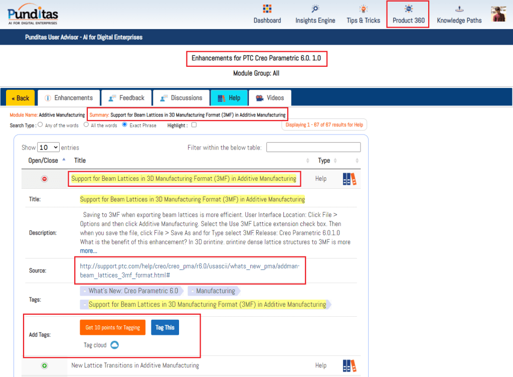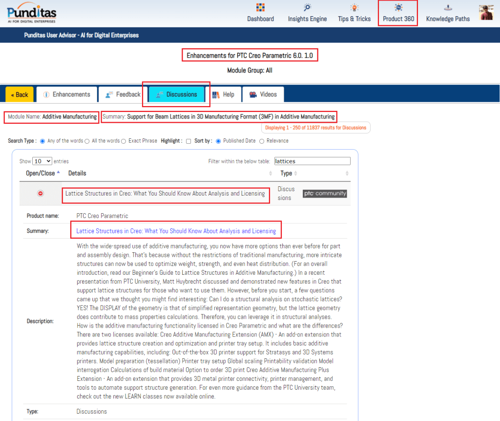 Punditas AI Advisor is a powerful platform as Users can access a single source of community chatter (discussions, opinions, suggestions) from both PTC and non-PTC sources. The image below shows discussions from PTC community related to “Additive Manufacturing” enhancement in Creo 6.0.1.0