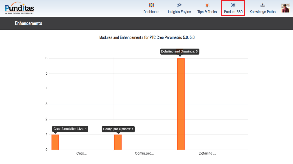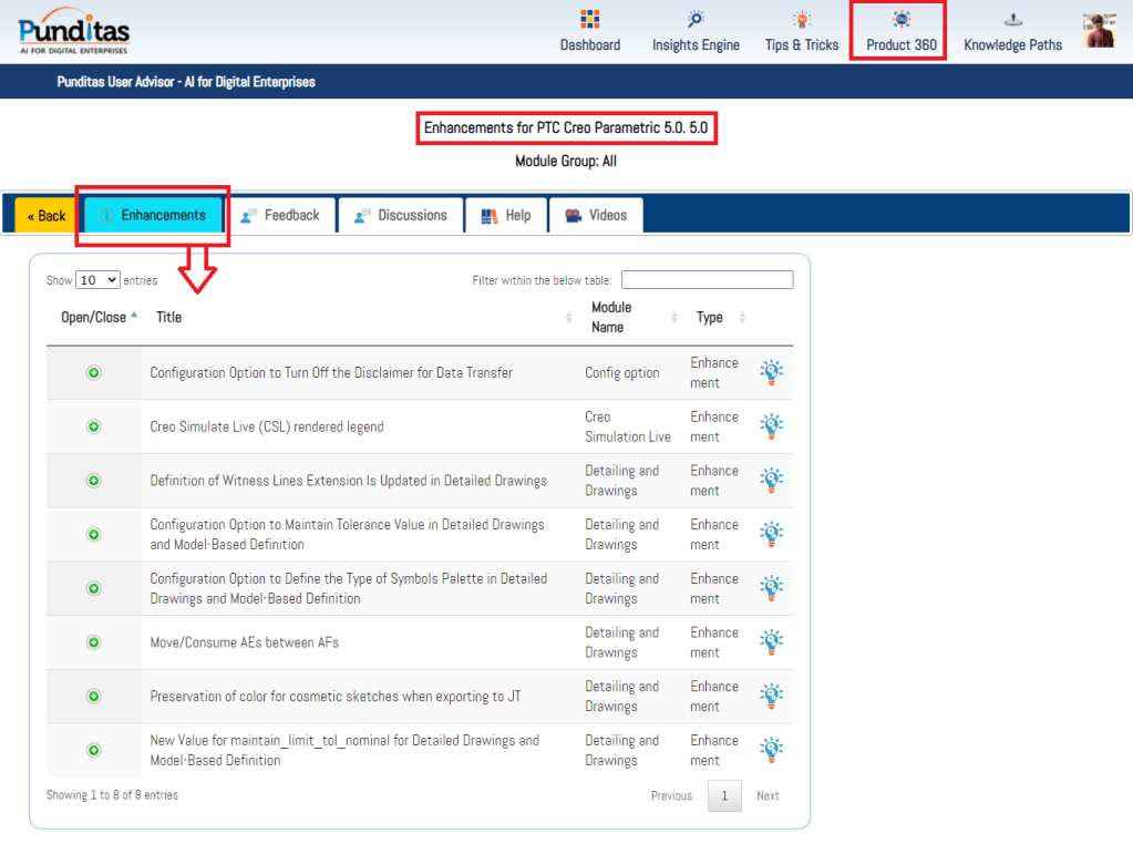PTC released Creo 5.0.5.0 recently. Punditas AI Advisor now supports this latest version of Creo 5.0.5.0. Punditas AI allows users to learn more about “How”, What” and “Why” of these enhancements through Product 360 module. The picture below shows the Module groups and the corresponding enhancements added within each group. To try this out, please signup for a FREE trial at Punditas AI