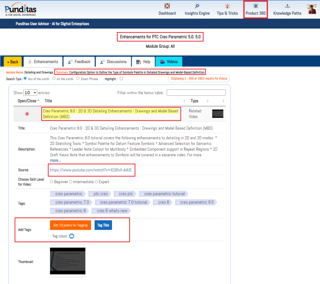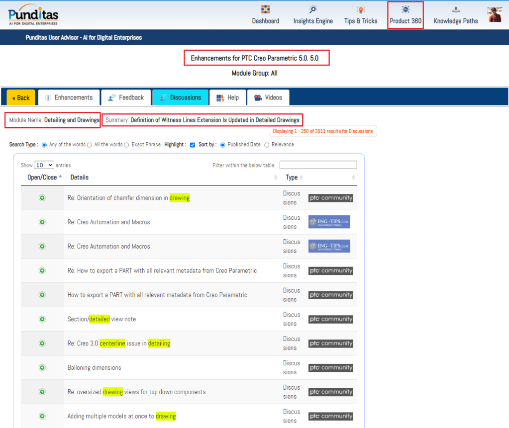 Punditas AI Advisor also offers Video Tutorials for every enhancement to help Users learn how to use the feature in Creo Parametric software. The image below shows the related videos for “Detailing and Drawings” that has been updated in Creo 5.0.5.0 These Videos are extracted and curated by Punditas AI engine from 10’s of repositories including PTC’s Learning Connector, YouTube, Vimeo, etc.