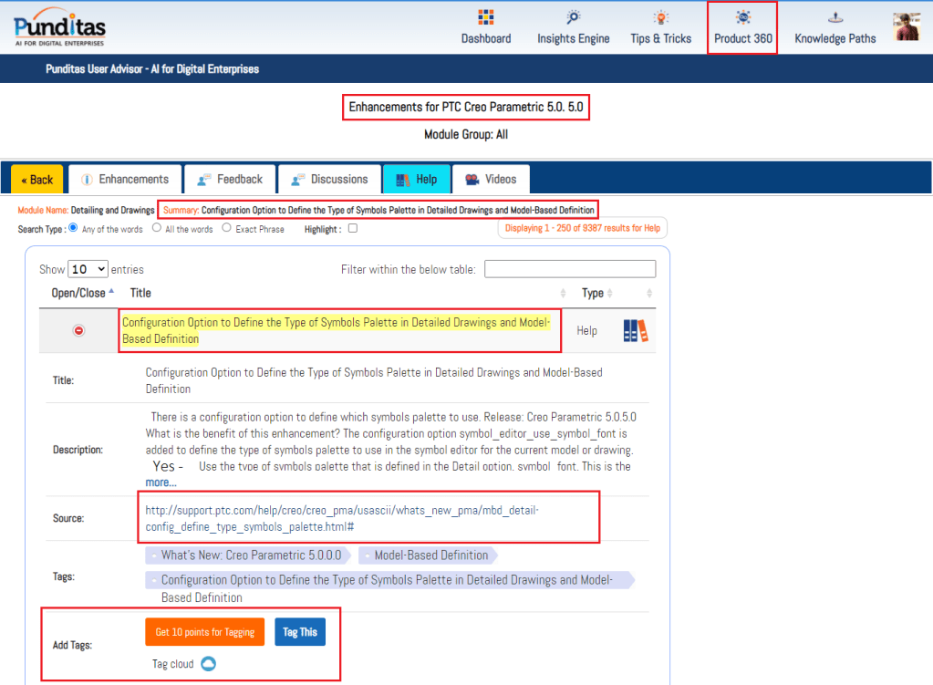 Punditas AI Advisor displays Help documentation for every enhancement as described by PTC in their Online Help. The image below shows Help articles that are relevant to “Detailing and Drawings” enhancement added to Creo 5.0.5.0