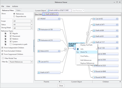 In Creo Parametric 6.0.0.0, you can zoom into the selected reference in the model, and to place it in the center of the graphics window. This makes it easier to identify and locate references when you are investigating.
