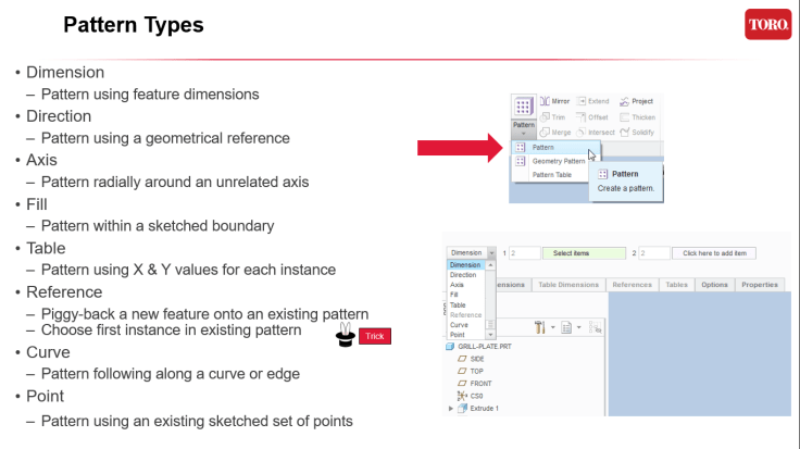 Mark Ganzer@Toro has done an excellent job covering Patterning in Creo – Basics, Performance & Tips in one his presentations. Here are some excerpts from his slide deck. Check out the Tips (below) in particular