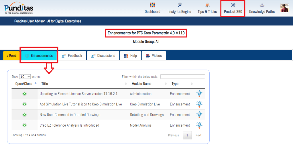 Punditas AI Advisor supports Creo 4.0 M110. Punditas AI allows users to learn more about “How”, What” and “Why” of these enhancements through Product 360 module. The picture below shows the Module groups and the corresponding enhancements added within each group. To try this out, please signup for a FREE trial at Punditas AI