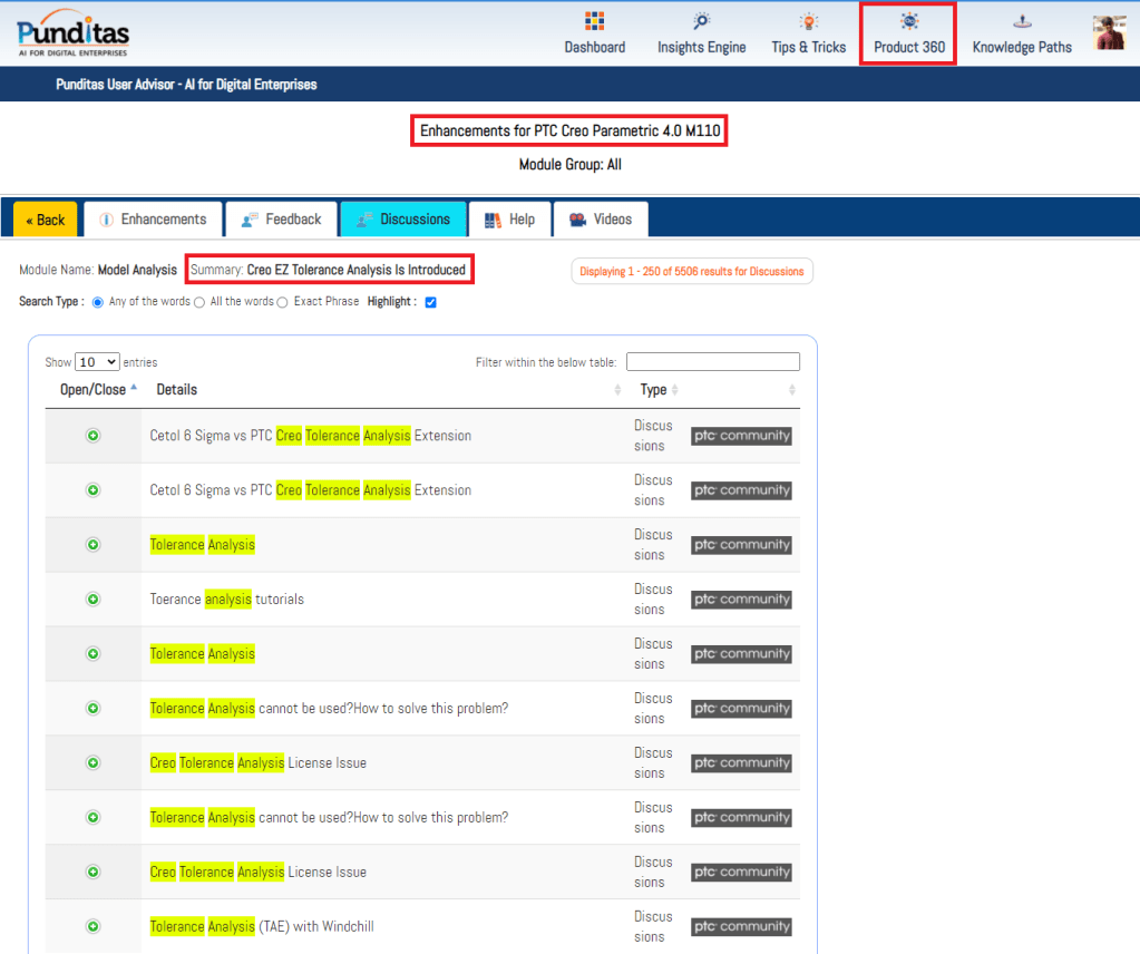 Punditas AI Advisor is a powerful platform as Users can access a single source of community chatter (discussions, opinions, suggestions) from both PTC and non-PTC sources. The image below shows discussions from PTC community related to “Model Analysis” enhancement in Creo 4.0 M110