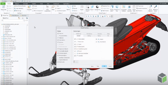Default settings for Model Tree in Part & Assembly mode is shown as below. The out-of-the-box settings include Features, Suppressed objects and annotations that appear by default in the Model Tree. This is changeable.