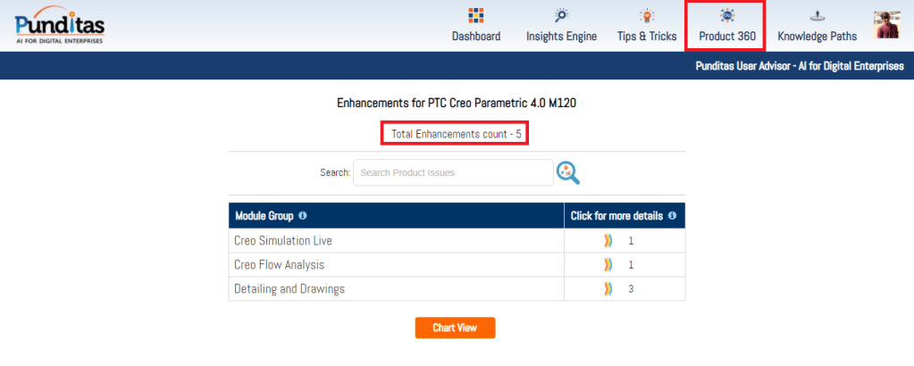 PTC released Creo 4.0 M120 recently. Punditas AI Advisor now supports this latest version of Creo 4.0 M120. Punditas AI allows users to learn more about “How”, What” and “Why” of these enhancements through Product 360 module. The picture below shows the Module groups and the corresponding enhancements added within each group. To try this out, please signup for a FREE trial at Punditas AI