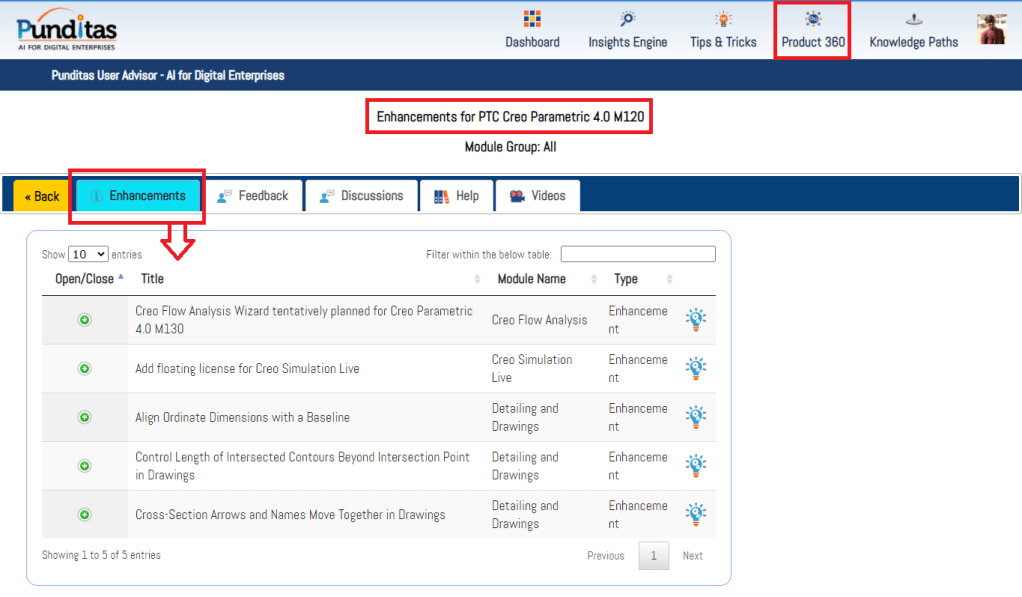 The Detailed View option in Punditas AI allows Creo Users to explore each enhancement in greater detail. The picture below shows the details of every enhancement in Creo 4.0 M120. Not only is the list of enhancements displayed but also the associated Video tutorials, Online Help documentation (provided by PTC) as well as community discussions around this topic