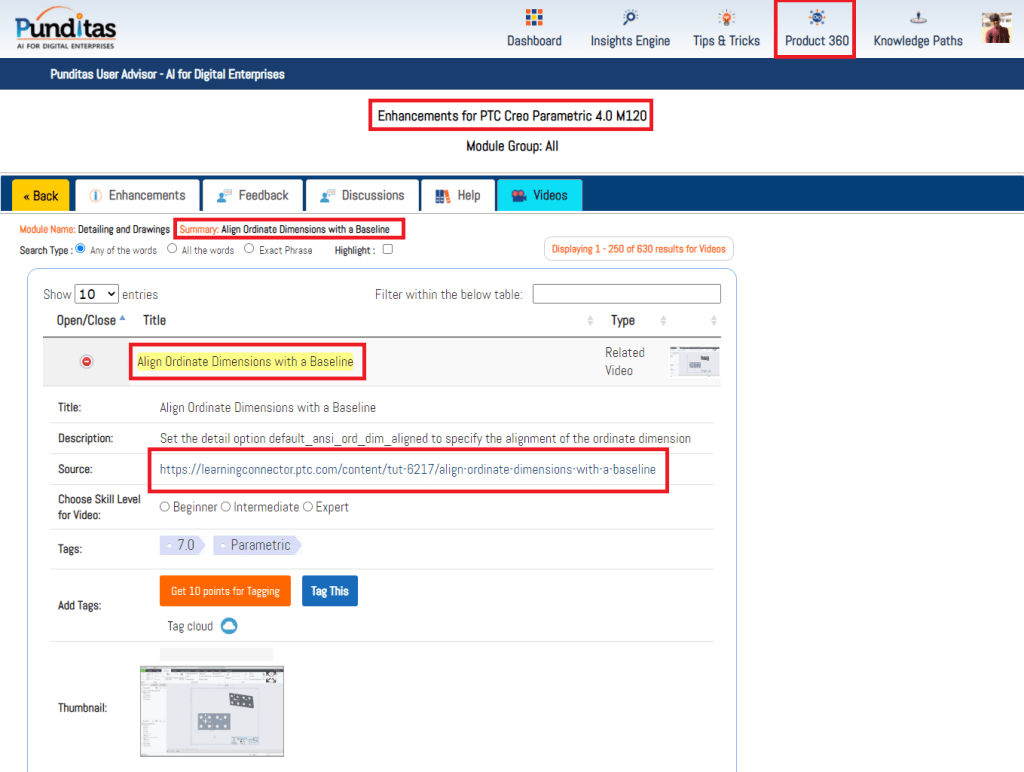Punditas AI Advisor also offers Video Tutorials for every enhancement to help Users learn how to use the feature in Creo Parametric software. The image below shows the related videos for “Detailing and Drawings” that has been updated in Creo 4.0 M120 These Videos are extracted and curated by Punditas AI engine from 10’s of repositories including PTC’s Learning Connector, YouTube, Vimeo, etc.