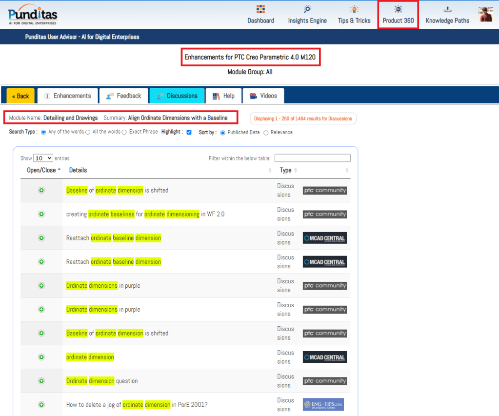 Punditas AI Advisor is a powerful platform as Users can access a single source of community chatter (discussions, opinions, suggestions) from both PTC and non-PTC sources. The image below shows discussions from PTC community related to “Detailing and Drawings” enhancement in Creo 4.0 M120