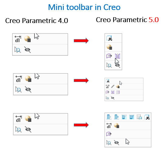 In Creo Parametric 4.0, when objects of different types are selected, a single invariant toolbar would appear. This has been improved with Creo 5.0 as shown below