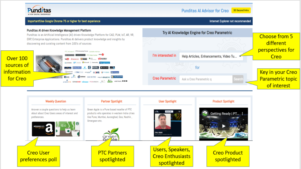 Punditas AI engine provides real time guidance on using Creo. Punditas AI delivers Tips, Tricks, Tutorials, Best Practices, Workarounds, Open bugs, Closed bugs and over 16 content streams that offer guidance on “how-to”, “what-to”, “when-to”, etc. within the Creo environment. This helps Users focus on creating designs in Creo faster and with more confidence
