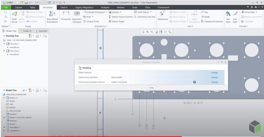 - The detail option, default_ansi_ord_dim_aligned, is available in the model and drawing environments.