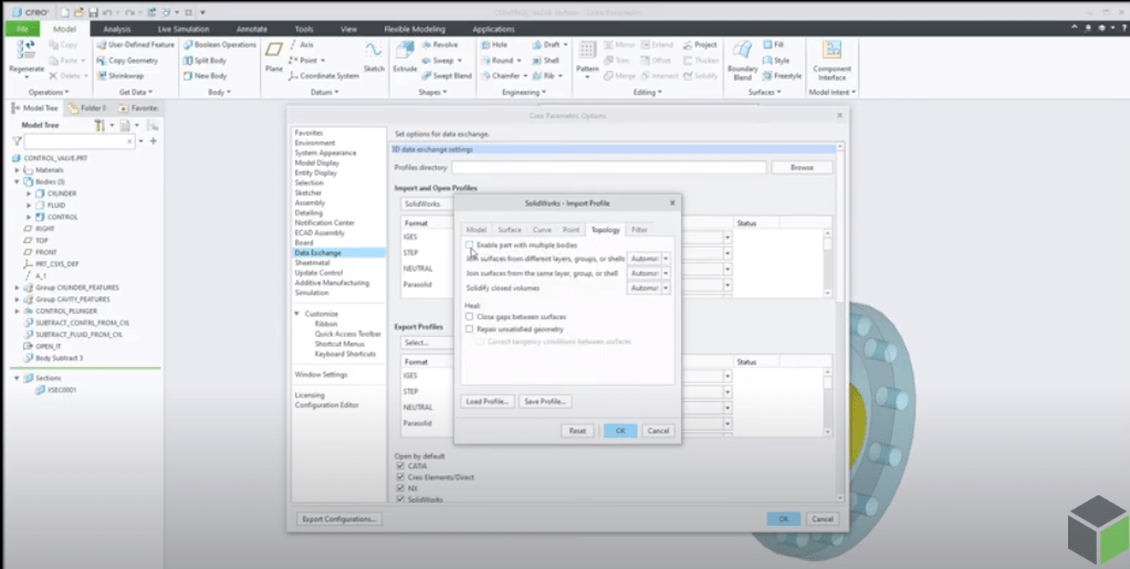 Starting with Creo 7.0, Multibody definition is maintained during data exchange. This helps preserve design intent during an Import/Export operation. The multibody definition is maintained in both exported and imported Creo Parametric 7.0 geometry.