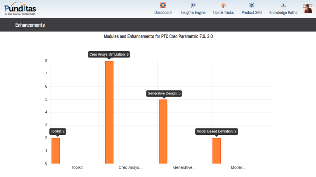 PTC released Creo 7.0.2.0 recently. Punditas AI Advisor now supports this latest version of Creo 7.0.2.0 . Punditas AI allows users to learn more about “How”, What” and “Why” of these enhancements through Product 360 module. The picture below shows the Module groups and the corresponding enhancements added within each group. To try this out, please signup for a FREE trial at Punditas AI