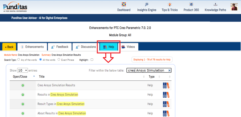 Punditas AI Advisor displays Help documentation for every enhancement as described by PTC in their Online Help. The image below shows Help articles that are relevant to “Creo Ansys Simulation” enhancement added to Creo 7.0.2.0