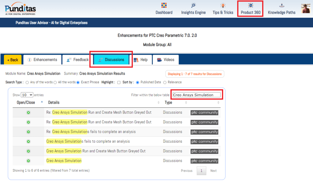 Punditas AI Advisor is a powerful platform as Users can access a single source of community chatter (discussions, opinions, suggestions) from both PTC and non-PTC sources. The image below shows discussions from PTC community related to “Creo Ansys Simulation” enhancement in Creo 7.0.2.0