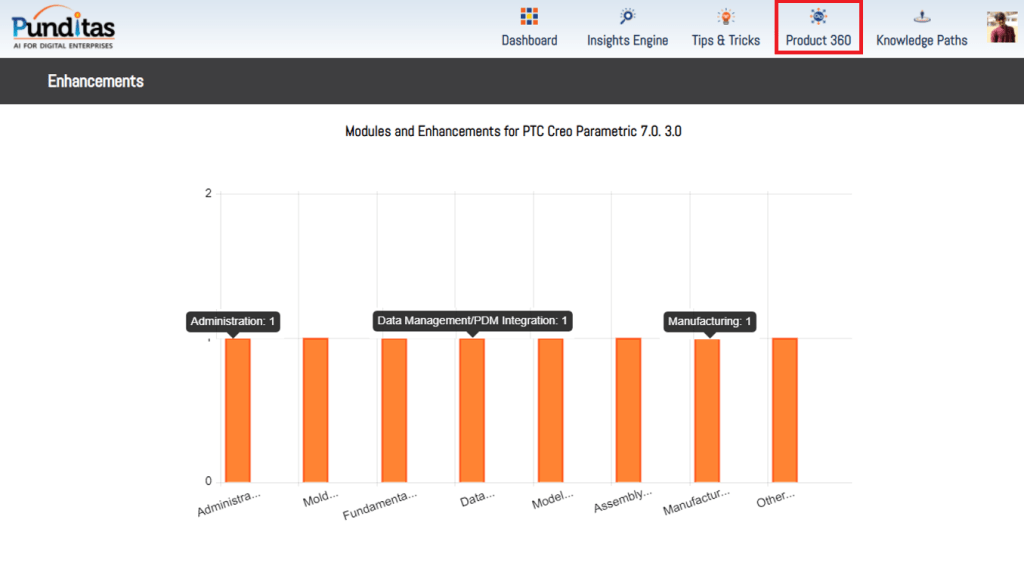 PTC released Creo 7.0.3.0 recently. Punditas AI Advisor now supports this latest version of Creo 7.0.3.0 . Punditas AI allows users to learn more about “How”, What” and “Why” of these enhancements through Product 360 module. The picture below shows the Module groups and the corresponding enhancements added within each group. To try this out, please signup for a FREE trial at Punditas AI