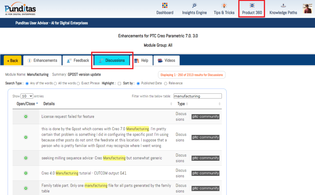 Punditas AI Advisor is a powerful platform as Users can access a single source of community chatter (discussions, opinions, suggestions) from both PTC and non-PTC sources. The image below shows discussions from PTC community related to “Manufacturing” enhancement in Creo 7.0.3.0